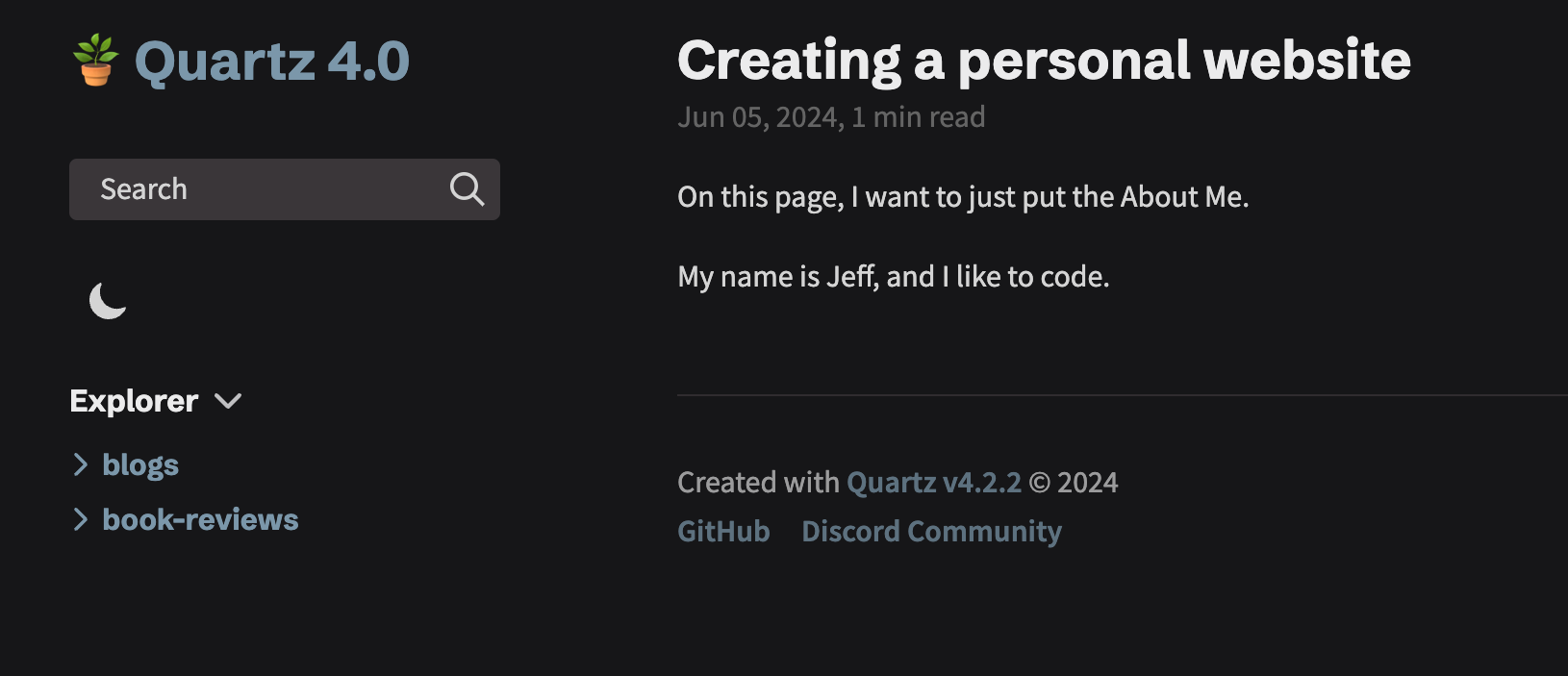Right now, the webpage says “Quartz 4.0.” We can change this to whatever we want. In the top-left corner, you should see a bar that says “Search.”